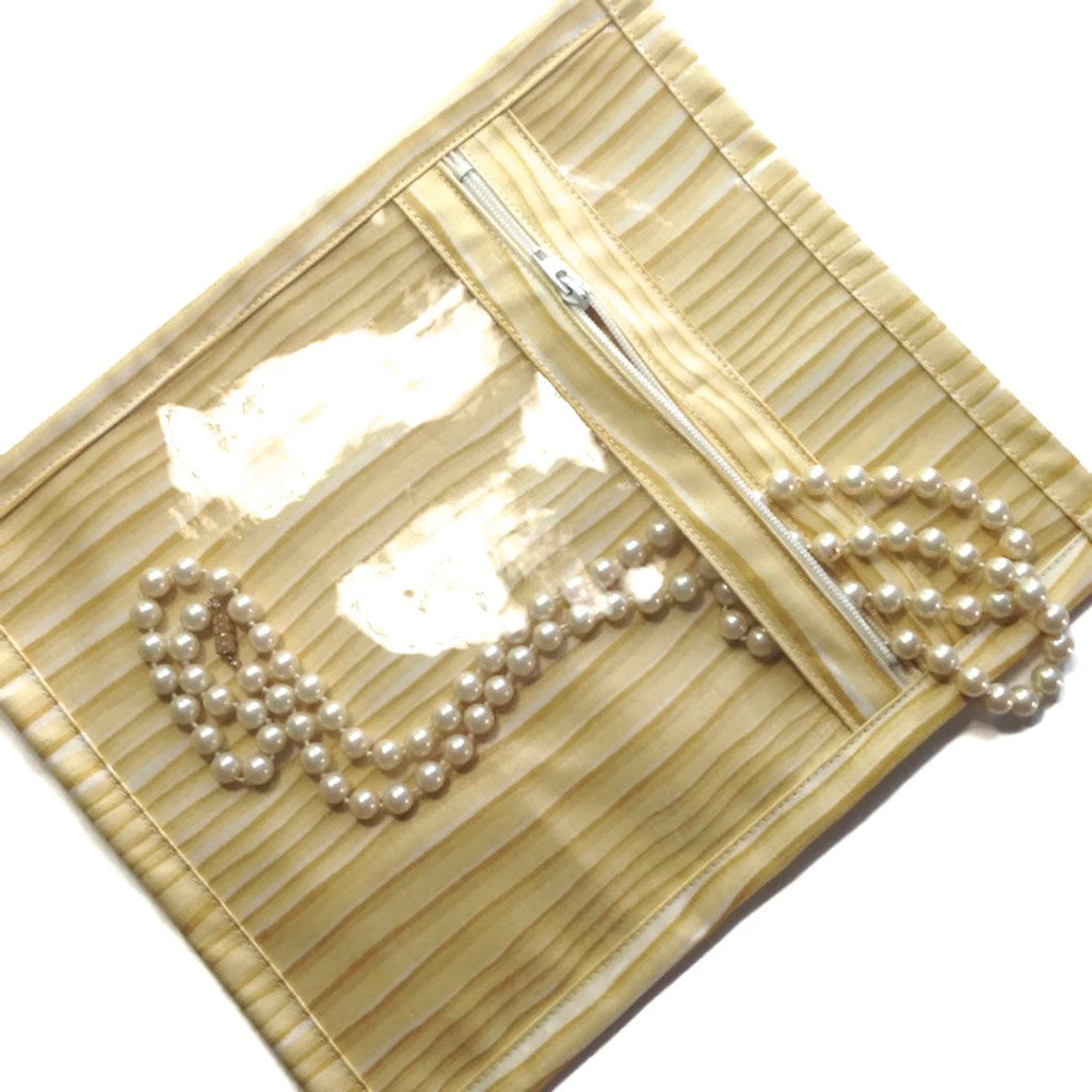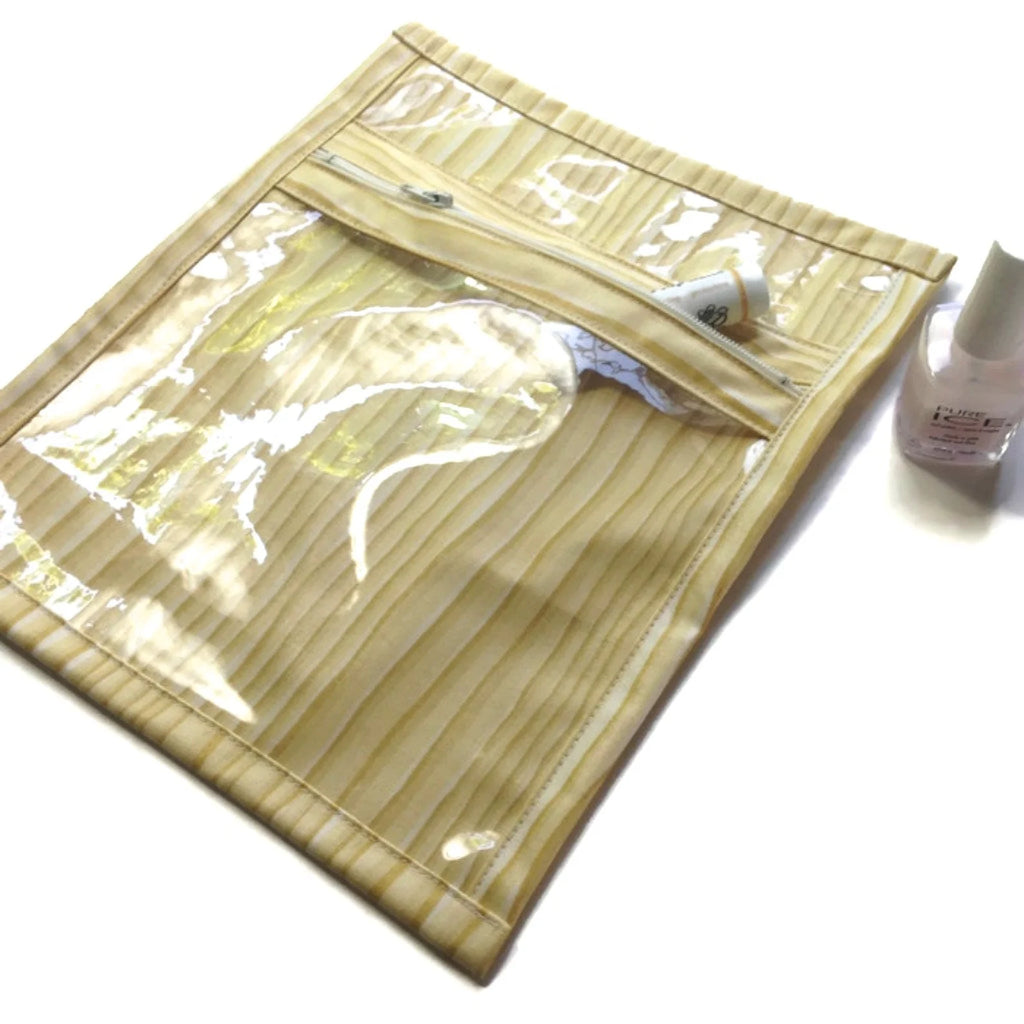 This small fabric pouch is 8 x 10-inches. It has a vinyl front, allowing you to see exactly what you have in it. Closure is with a zipper in the front.