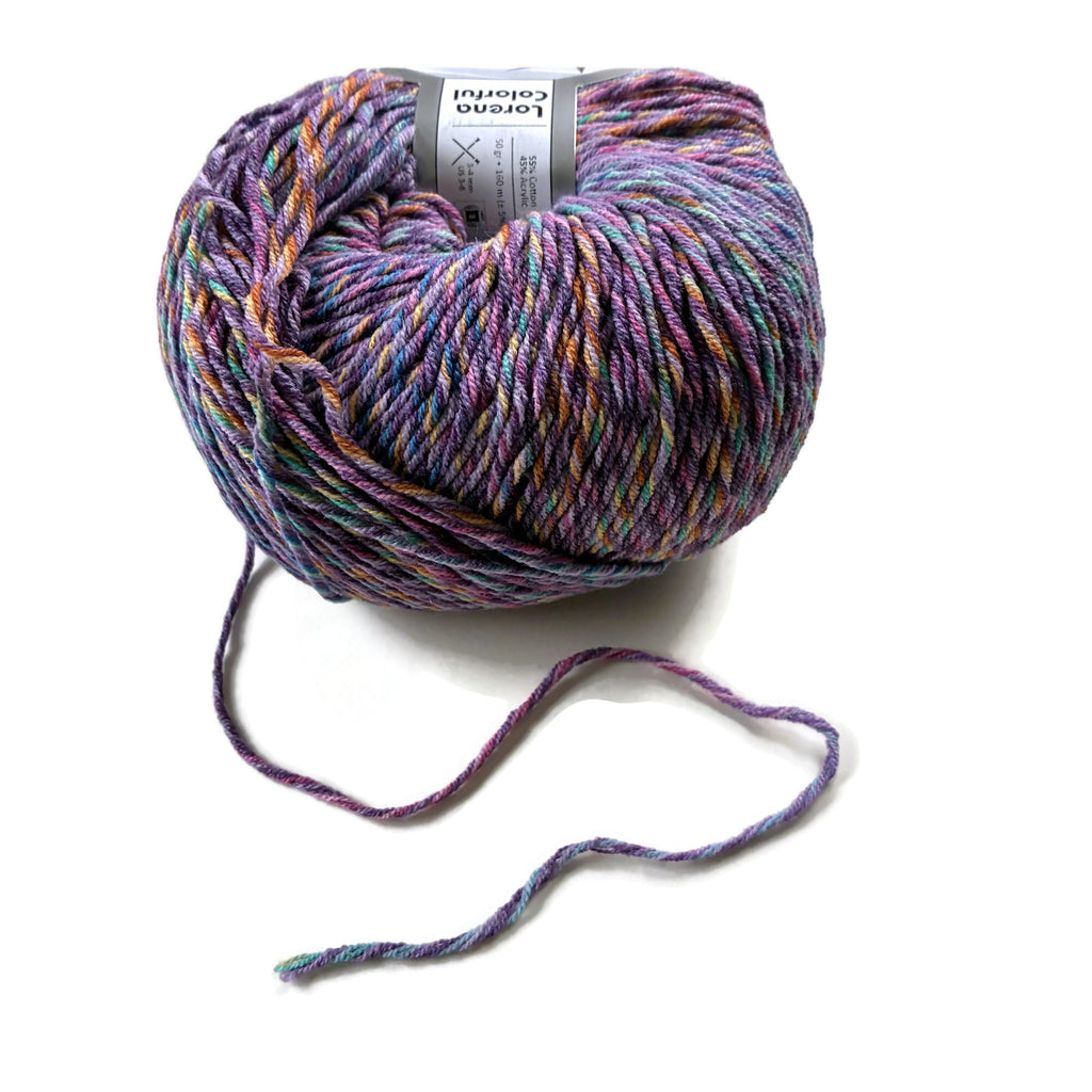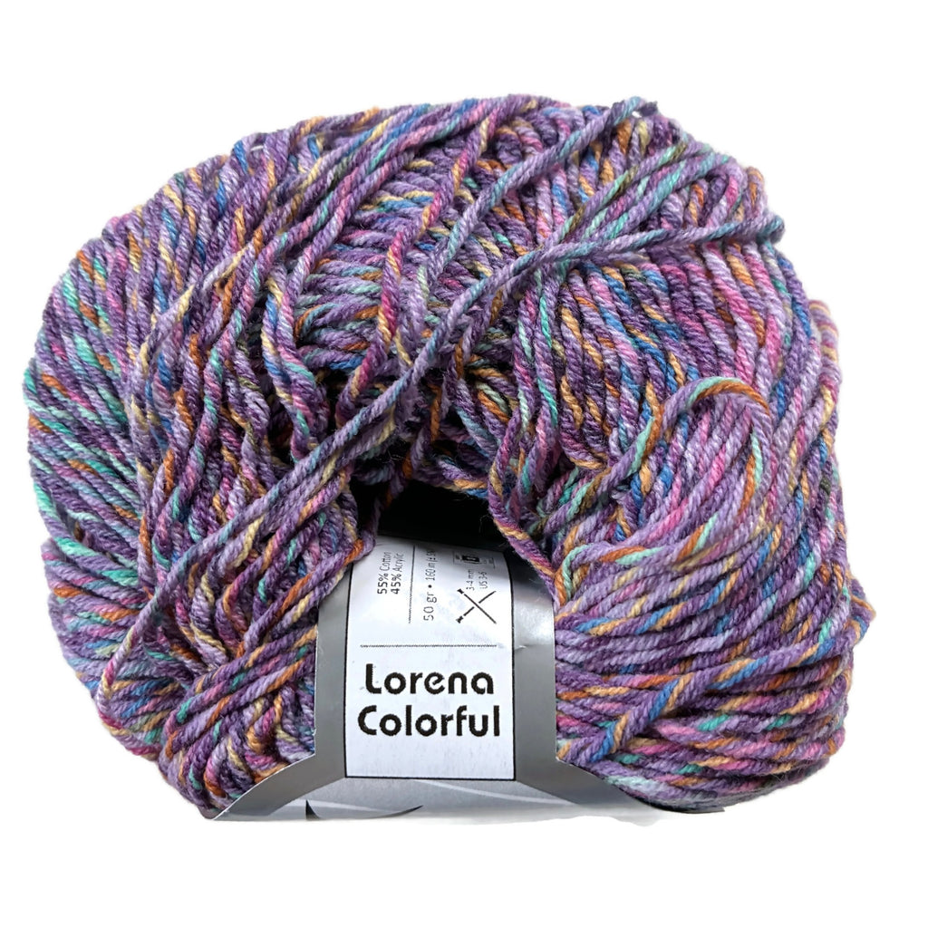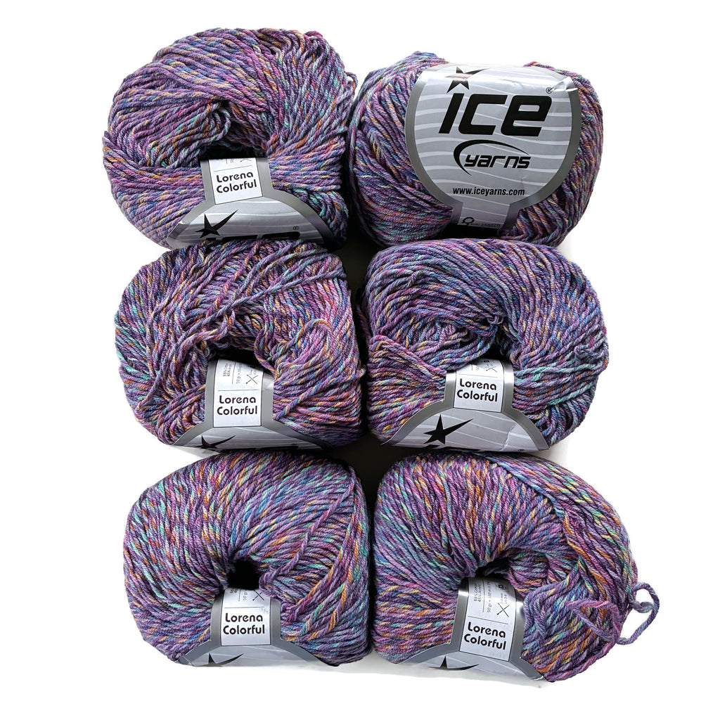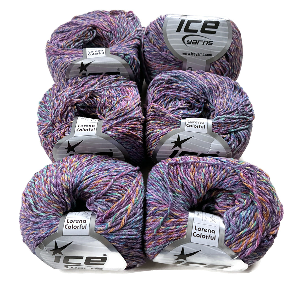 Cotton Blend Knitting YarnICE Lorena Colorful6x50 Gram (160m) SkeinsDK WeightUS 3-6 Needle (3-4mm)55% Cotton45% AcrylicThis is a smooth, multi colored yarn of purples, violets, turquoise and tangerine.