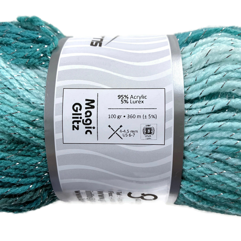 ICE Yarns "Magic Glitz"3 x 200 Gram/360m Skeins95% Acrylic5% Lurex US 6-7 Needle/4-4.5mmDK WeightThis is a space dyed yarn in several shades of teal with silver metallic accents.