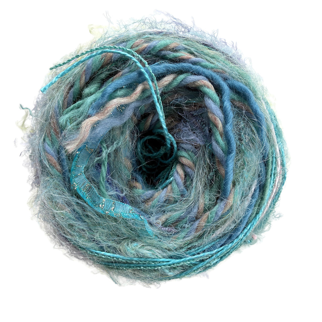 It is a combination of a dozen or more different yarns, resulting in a blended yarn of unique colors and textures.