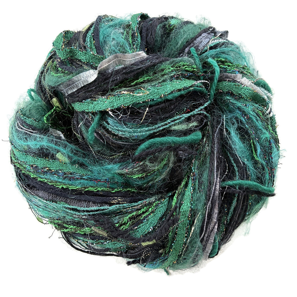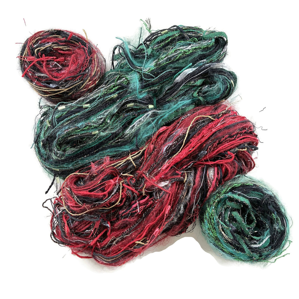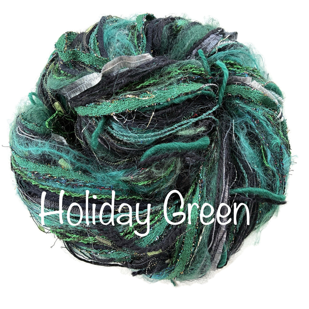 This color way includes several different green yarns and touches of black and gray. I have used lots of metallics for holiday sparkle!