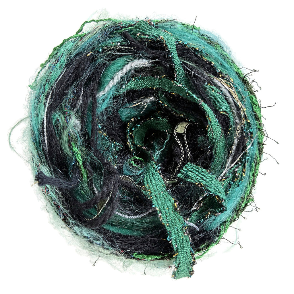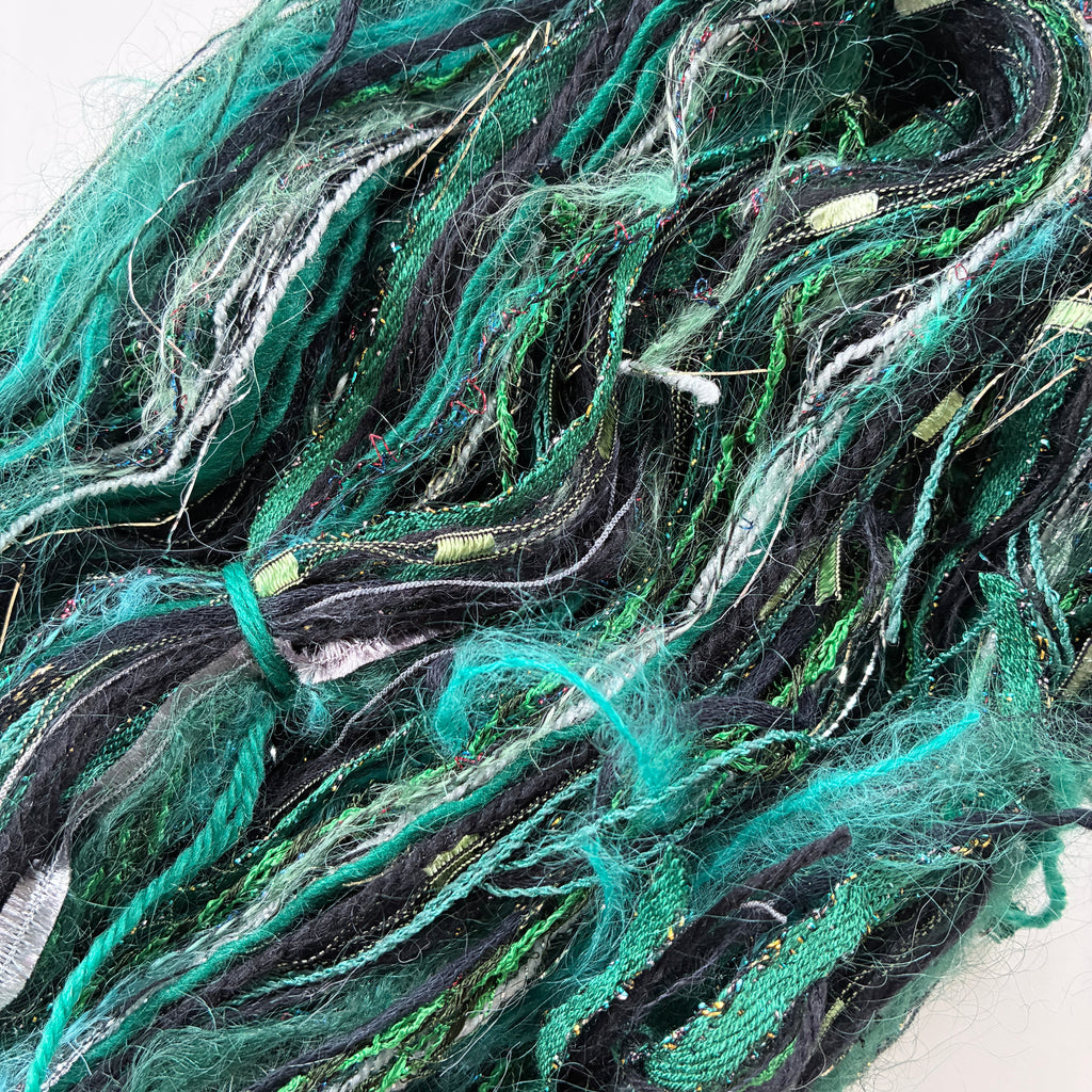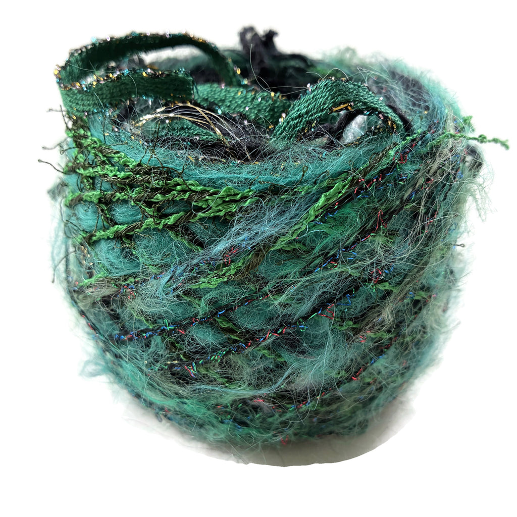 This is a combination of a dozen or more different yarns, resulting in a blended yarn of unique colors and textures when knitted.