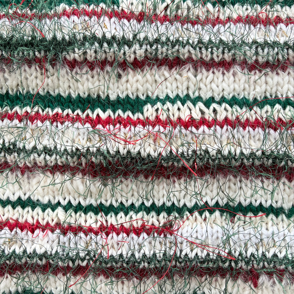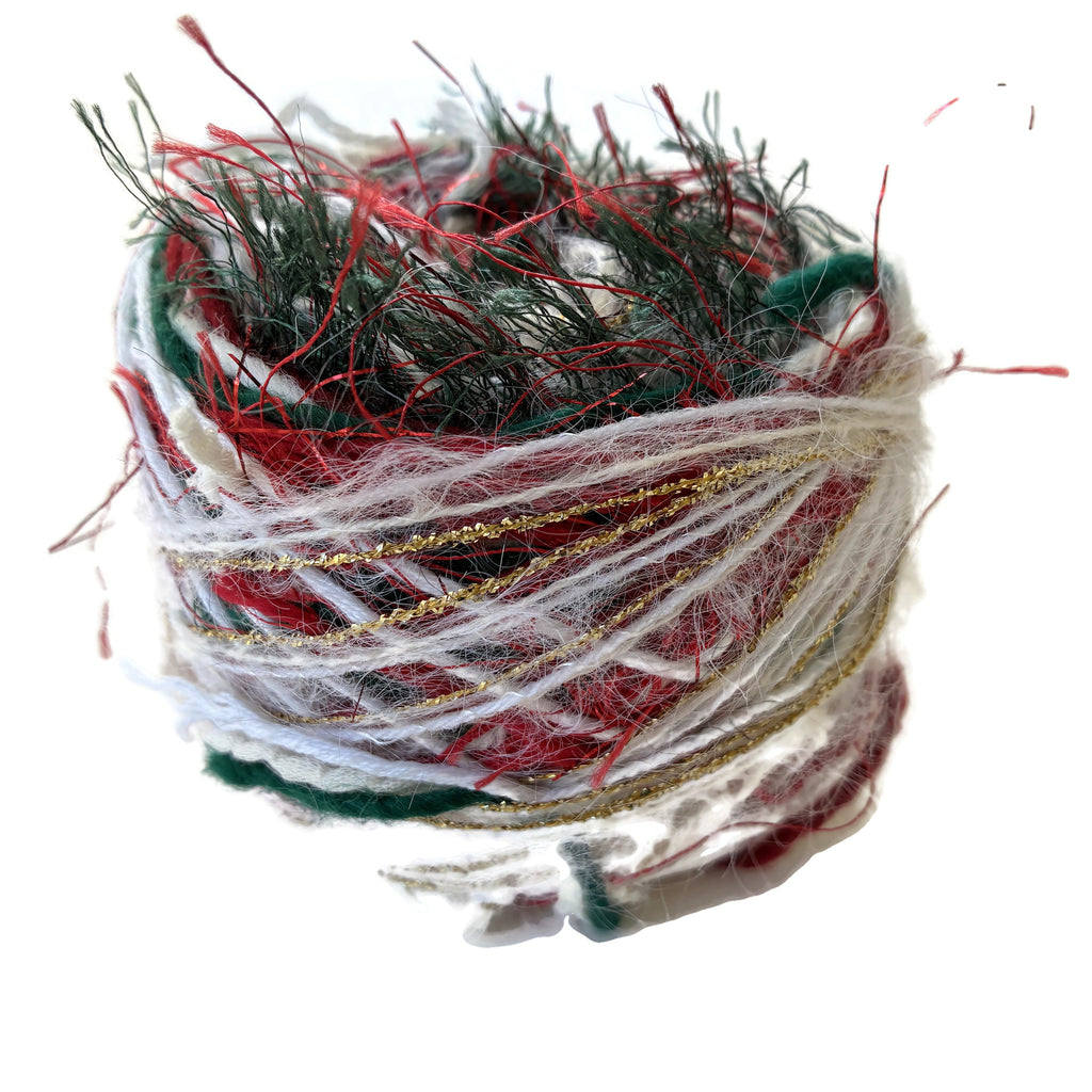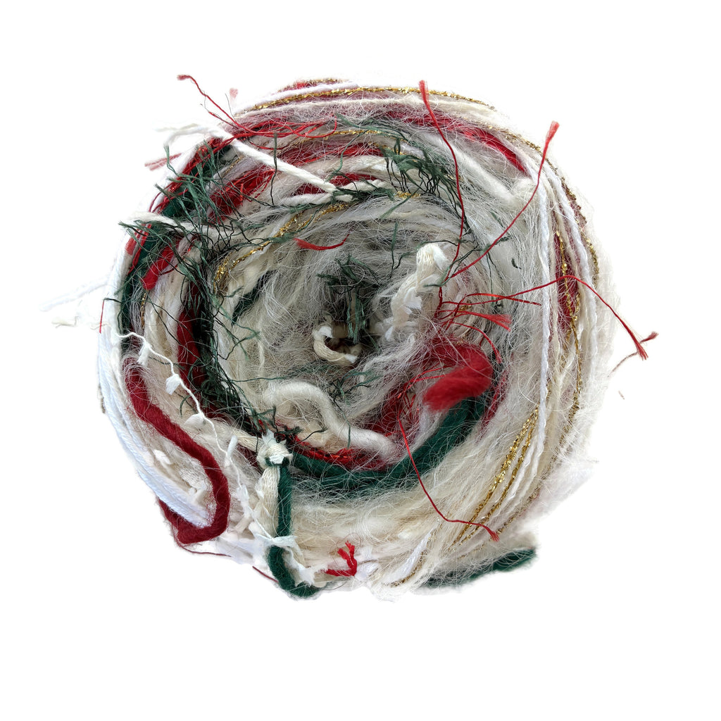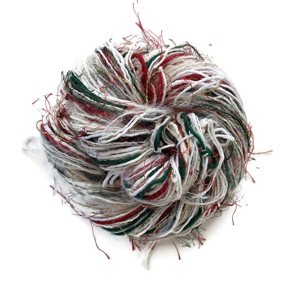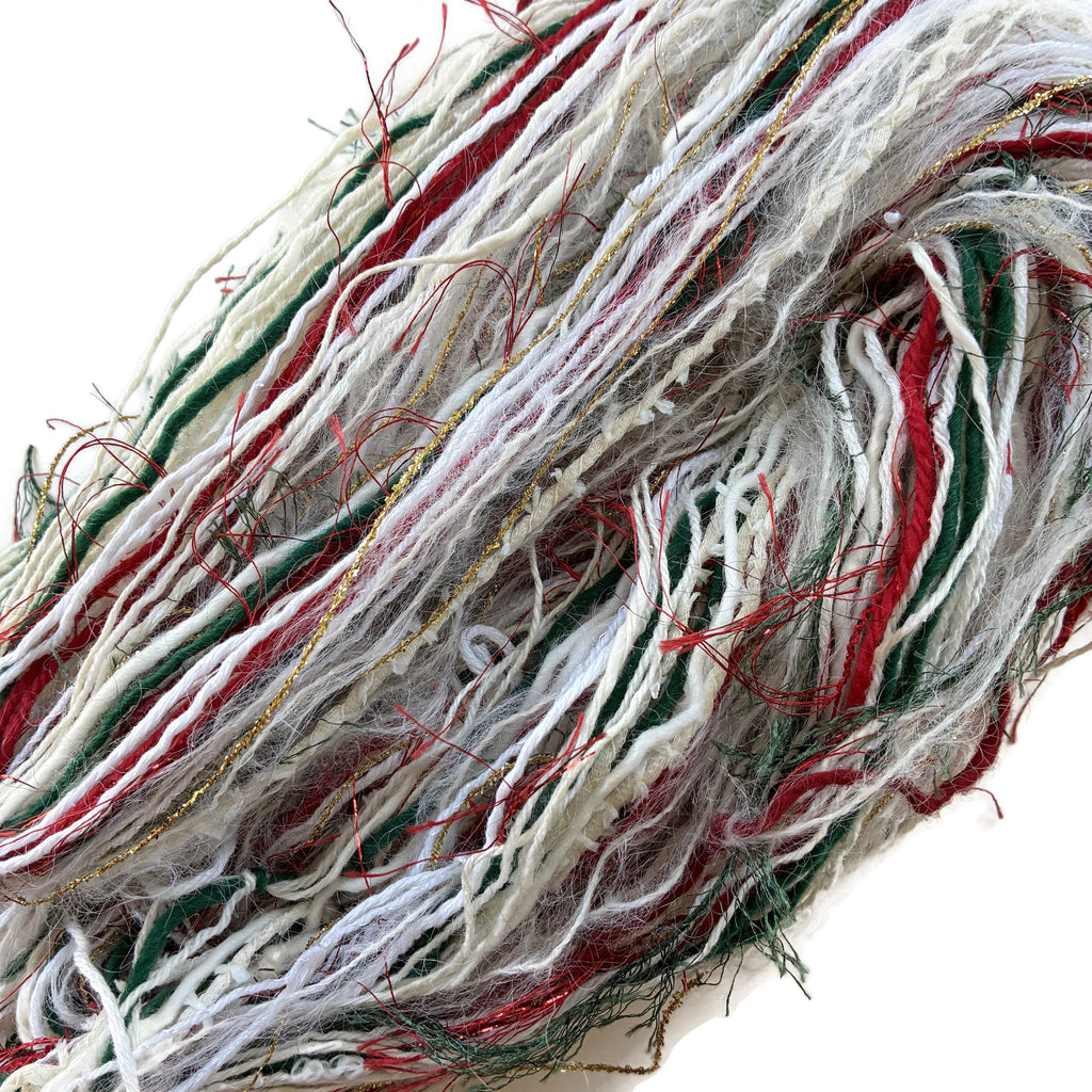 It is a combination of a dozen or more different yarns, resulting in a blended yarn of unique colors and textures. This particular color way is comprised of several different white or natural colored yarns with pops of green and red. I have also aded a faux fur, some eyeless and metallic for sparkle!