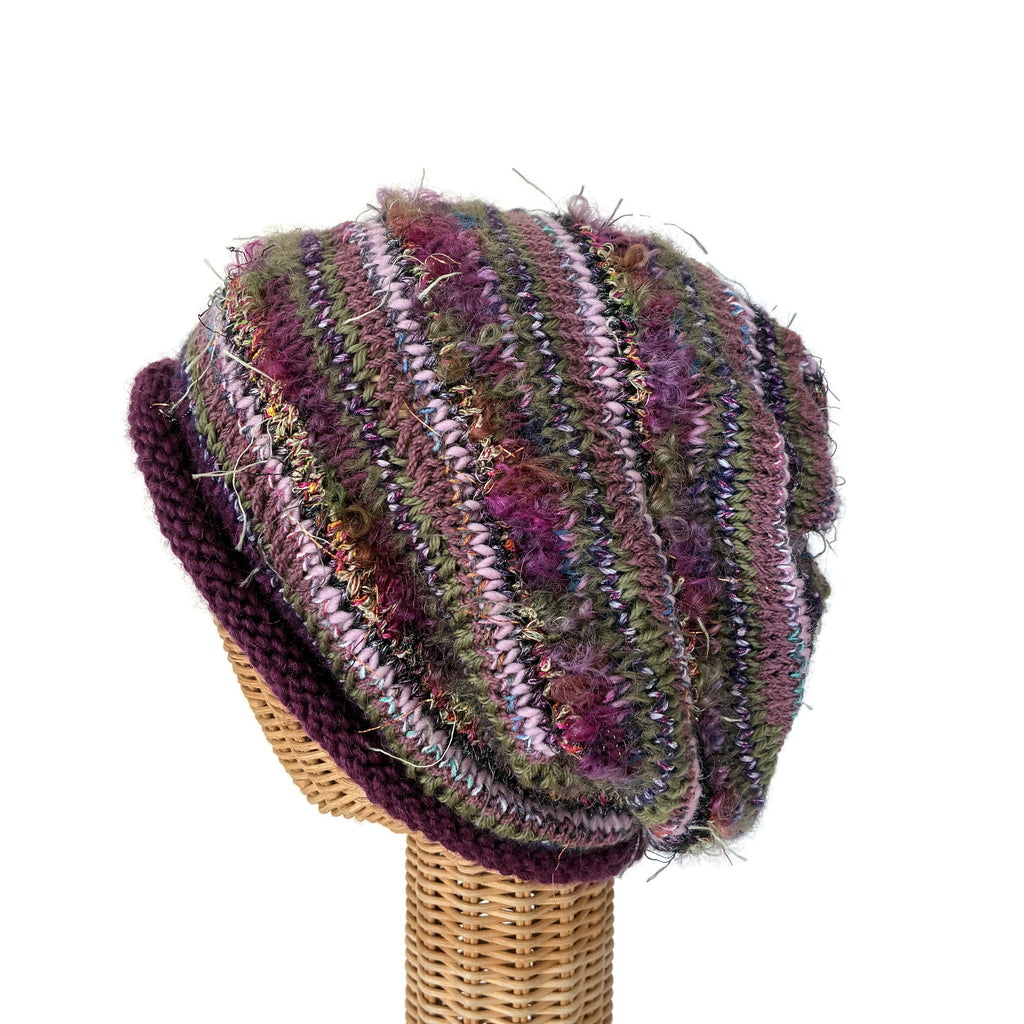 This hand knit hat is a slouchy style with a rolled brim. It was knitted with Buttermilk Cottage own boutique yarn, FUSION.