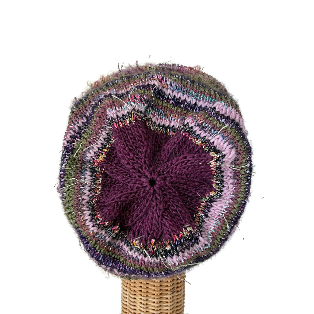 Crown is detailed with a star design in the same solid mauve wool and mohair yarn used to knit the rolled brim.